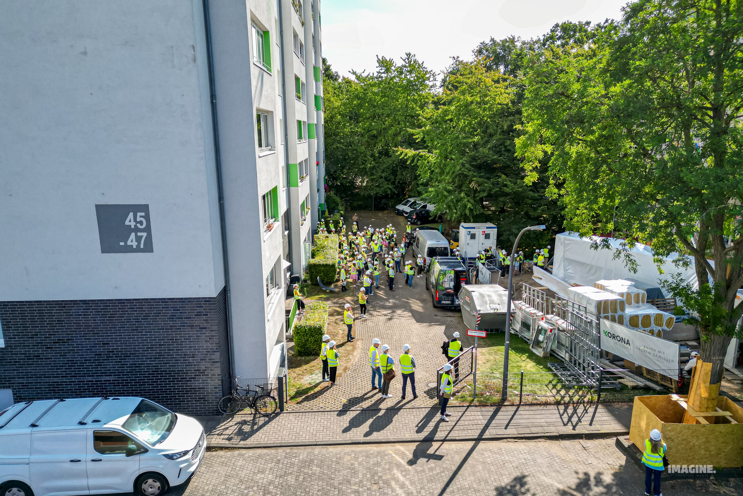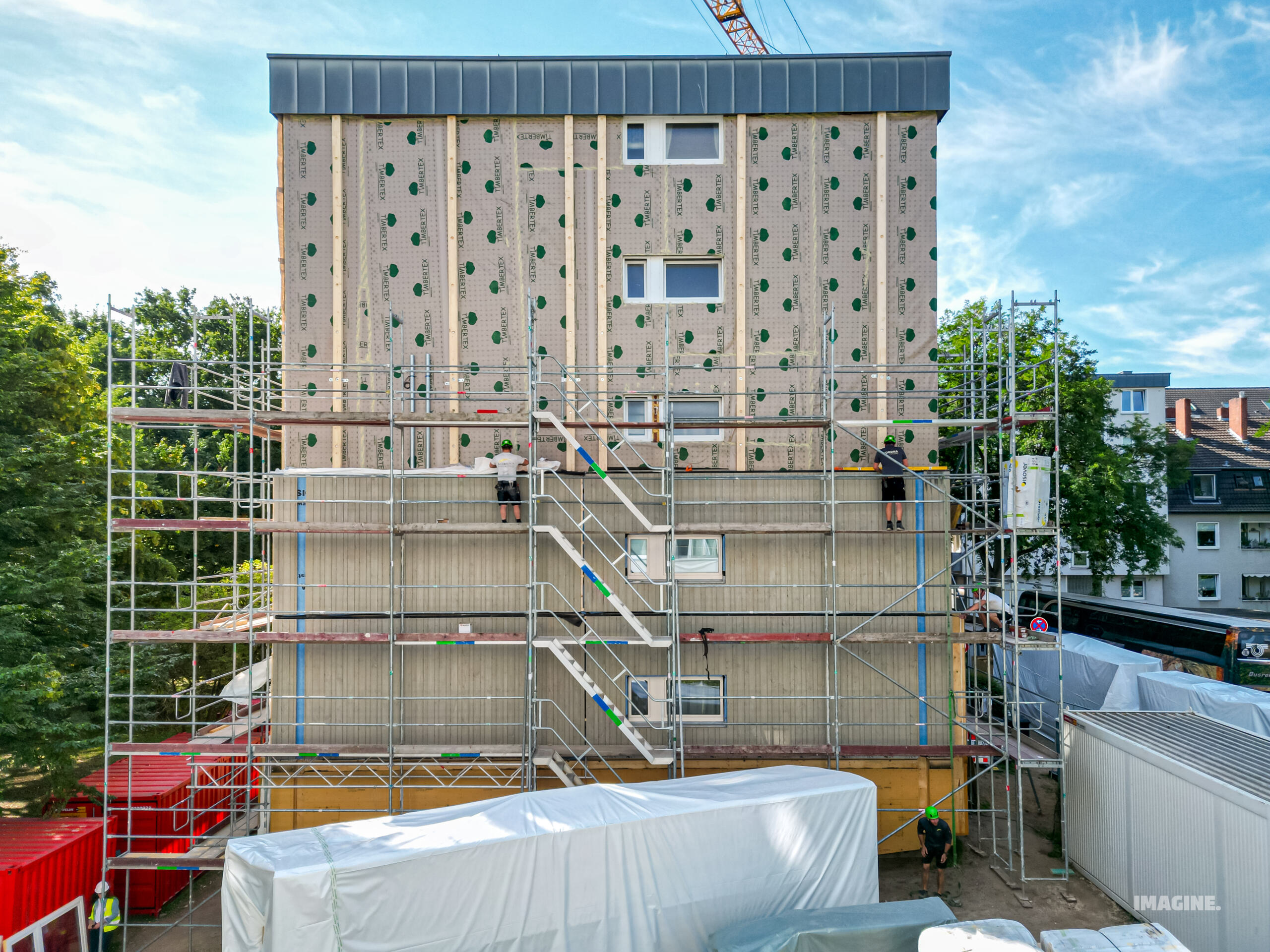 Gemeinsam mit den Teams vor Ort konnten die Teilnehmenden live erleben, wie vorgefertigte Fassadenelemente – die berühmten „fliegenden Fassaden“ – montiert werden. Besonders unser gemeinsames Projekt in Köln‑Zollstock rückte dabei in den Mittelpunkt: Die serielle Sanierung eines Mehrfamilienhauses in der Schwalbacher Straße, realisiert mit der Wohnungsgenossenschaft am Vorgebirgspark, teamtektura und Korona Holzbau.